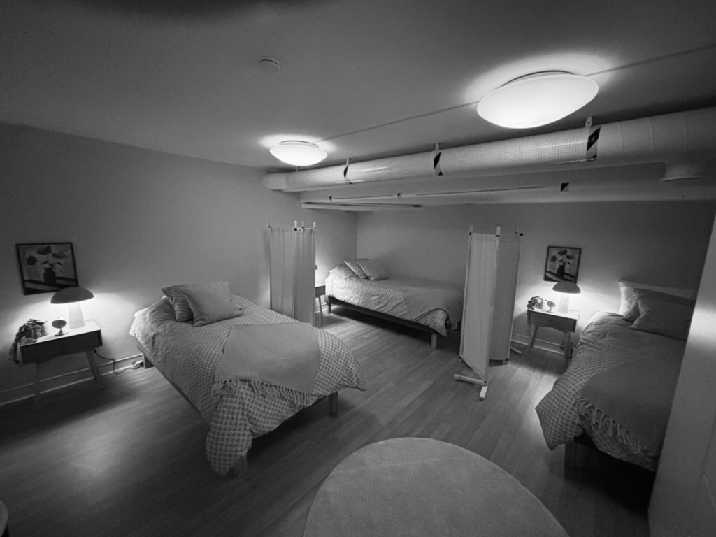 På gården finns sängar för de som behöver vila på dagen. För de mest behövande ordnar vi temporära boenden. Målet är alltid att hjälpa till med långsiktiga lösningar genom att söka stöd och ta kontakt med myndigheter i den mån vi har möjlighet.